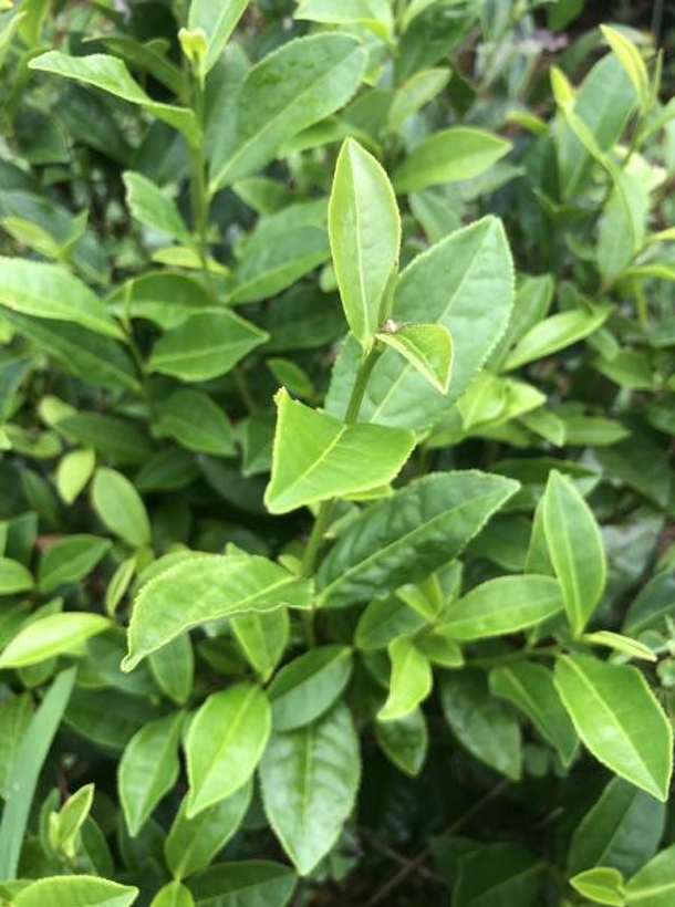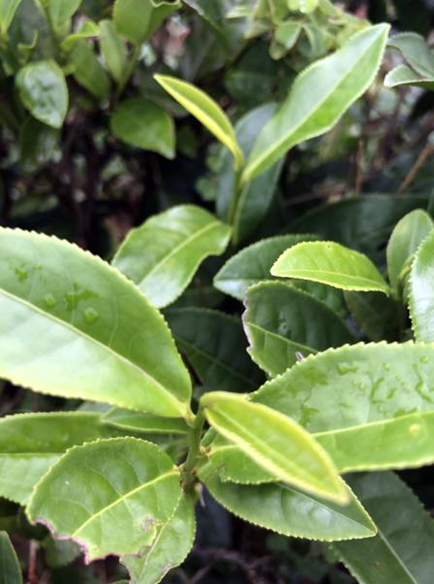 【性状特征】无性系,小乔木,中叶类,中芽种。该品种树姿直立,分枝密度中等。叶片上斜着生,叶片长7.7~10.6cm,叶宽2.9~4.2cm,叶长椭圆形,叶色绿且有光泽,叶尖锐尖,叶肉厚而微隆,叶面平,叶脉9~10对,叶齿浅密。